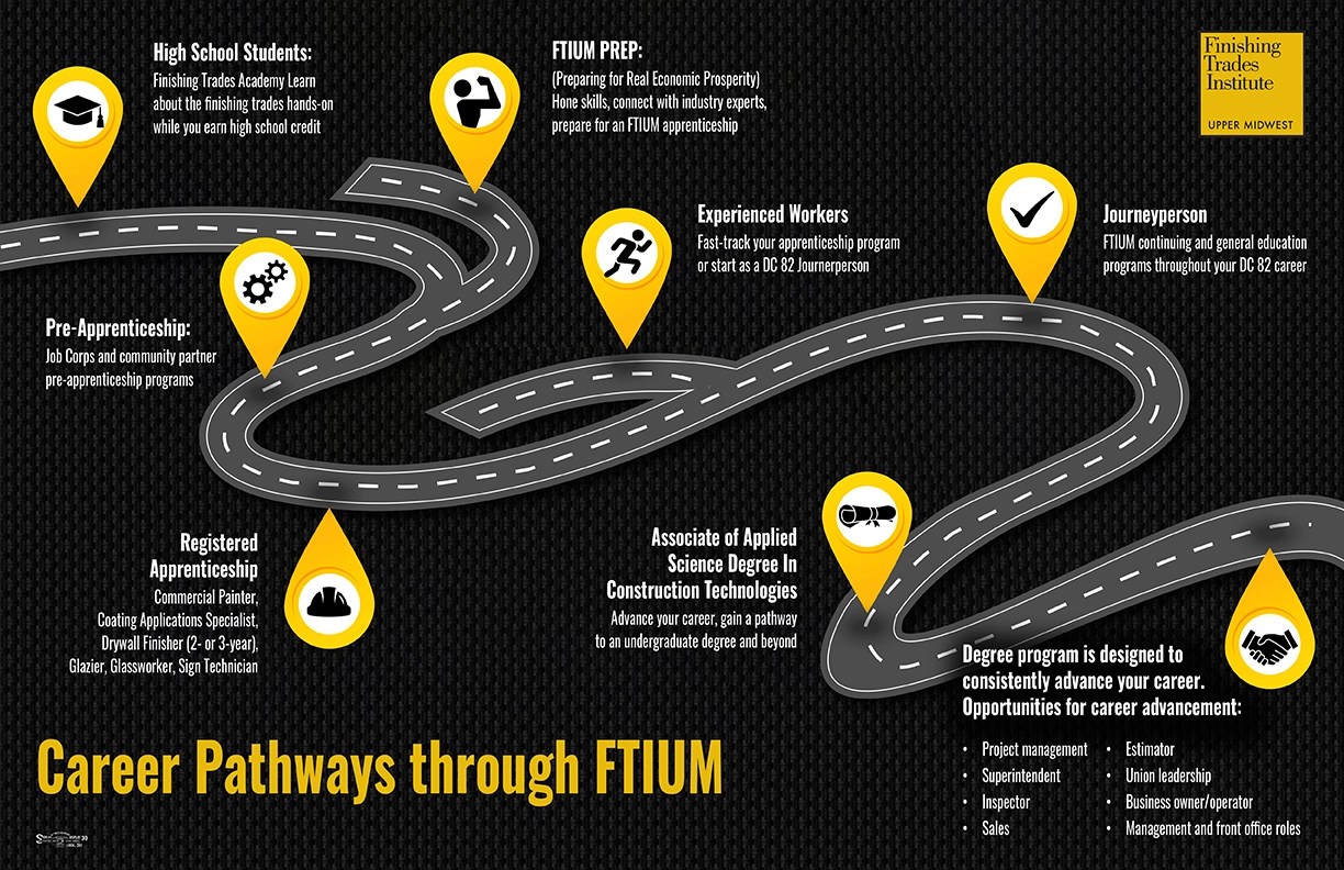 The associate of applied science degree in construction technologies is available to almost all those who are currently enrolled in or completed an apprenticeship with the Finishing Trades Institute of the Upper Midwest. Students enrolled in this program will learn all the aspects of their apprenticeship trade such as glazier, glassworker, drywall finisher (3-year program only), commercial painter, and coating application specialist, and then add five trade-focused general education courses.